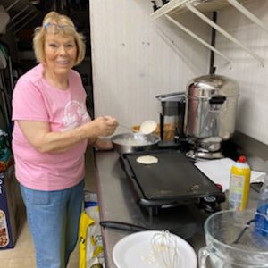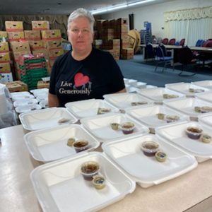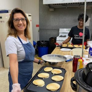 One of the stations distributes a hot breakfast prepared by the “Pancake Ladies” – members of the church and friends of the foundation – who joyfully prepare a hot breakfast of pancakes and other breakfast food. Prior to COVID the pancake breakfasts were served inside the fellowship hall, but CDC safety regulations put a stop to sit down meals. The pancake ladies adapted to distributing to-go breakfasts to the food recipients, so they are not only receiving food boxes with enough food for up to two weeks, but also alleviating early morning hunger.